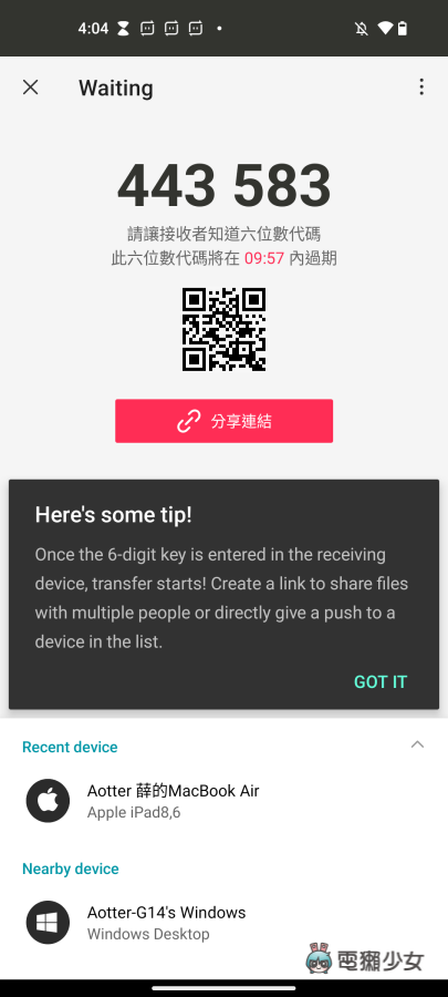 先让我设定一个情境,Android 手机使用者要传照片给自己的 MacBook(此处我拿 Nothing Phone (1) 做示范),在下载好 Send Anywhere 後,选择你想要传输的档案按传送,这时你可以选择用 6 码的金钥数字、QR Code 或是分享连结的方式传输档案,请在十分钟内在你的目标装置中做出相对应的动作,档案就传送成功了呦