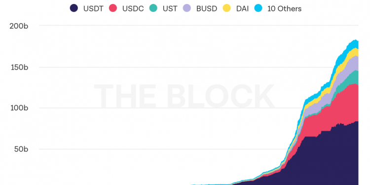 上图:各大稳定币的供应量增长情况。图源:The Block