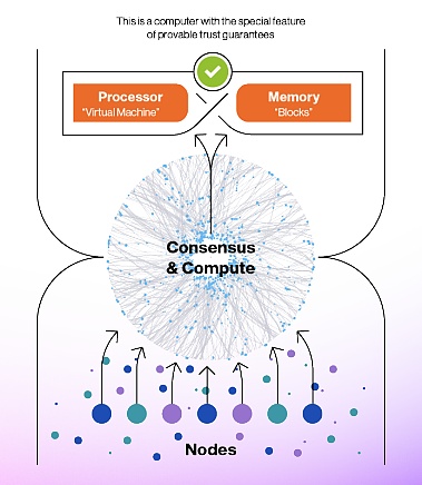 区块链网络由节点组成:物理计算机,如 PC,通过共识机制被连接在一起。