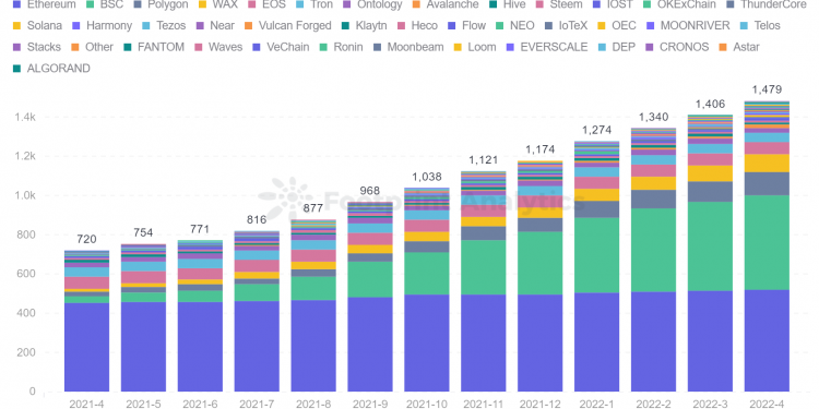 据 Footprint Analytics 数据显示,截止 4 月 30 日,已经有 38 条公链参与到 GameFi 领域中,游戏项目数高达 1,479 个,环比增幅 5.2%。